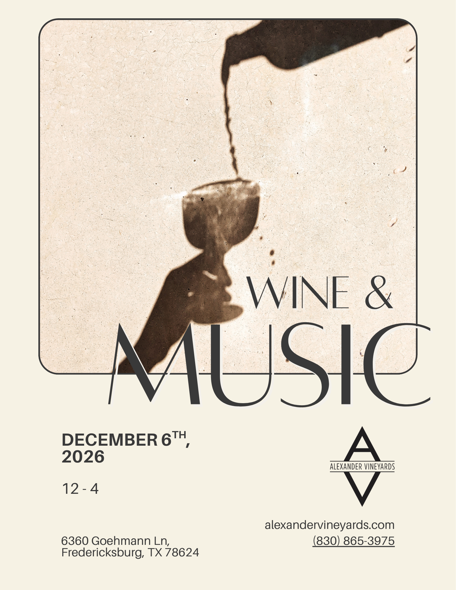 Wine & Music Sunday, December 6, 2026 12:00 PM 4:00 PM 12:00 16:00 Alexander Vineyards 6360 Goehmann Lane Fredericksburg, TX, 78624 United States (map) Google Calendar ICS Join us for Wine & Music from 12:00 PM - 4:00 PM in the tasting room! Artist & Ticket Details Coming Soon